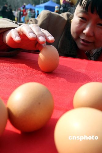 三月二十日,是中國(guó)二十四節(jié)氣中的春分。北京春分朝陽民俗文化藝術(shù)節(jié)閃亮登場(chǎng),民眾紛紛“豎”雞蛋迎春分!按悍值剑皟呵巍,中國(guó)春分時(shí)節(jié)的“豎蛋游戲”,目前已成為世界性的游戲。中新社發(fā) 任海霞 攝