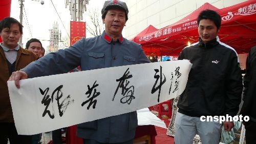 3月22日,幾位市民正在用手機(jī)給特型演員楊立達(dá)拍照。當(dāng)日,受安徽省亳州市一家企業(yè)邀請,長相酷似偉人毛澤東的特型演員楊立達(dá)在市區(qū)剛露面,就被許多市民團(tuán)團(tuán)圍著,并紛紛與他合影留念,楊立達(dá)還現(xiàn)場為市民揮毫潑墨,贈送書法作品。中新社發(fā) 劉勤利 攝