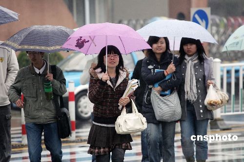3月24日,山東濰坊,行人們冒雨行走于市區(qū)街頭。當(dāng)日,一場小雨雪天氣造訪山東濰坊市區(qū),同時氣溫也隨之大幅下降,最低氣溫跌至零下3攝氏度,讓人們領(lǐng)教到了“倒春寒”的威力。中新社發(fā) 張馳 攝