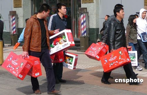 2009年3月31日,北京王府井奧運(yùn)特許商品店,顧客竟相搶購各類奧運(yùn)紀(jì)念品。當(dāng)日,手提大包小裹奧運(yùn)紀(jì)念品的人們成為金街一道靚麗風(fēng)景。按照相關(guān)規(guī)定,奧運(yùn)特許商品銷售日期截止到31日24時(shí)。北京一些大型商場(chǎng)內(nèi)的奧運(yùn)特許商品銷售點(diǎn)紛紛以超低價(jià)格進(jìn)行拋售。中新社發(fā) 玉龍 攝
