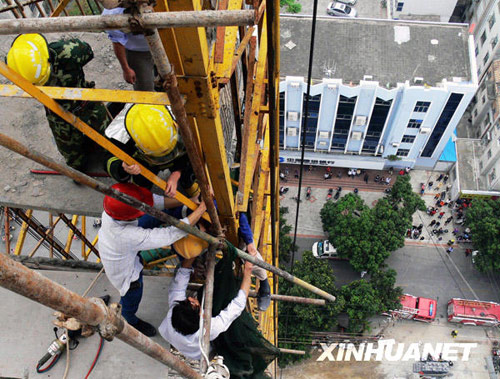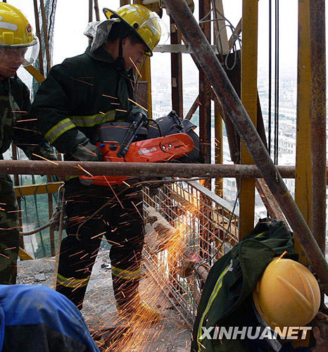 4月11日,在廣西北海市深圳路一個(gè)施工工地,消防官兵正在營(yíng)救被困工人,被困者身穿藍(lán)衣,手腳被升降機(jī)吊架卡住。當(dāng)日上午,在廣西北海市深圳路一個(gè)施工工地,一名工人不慎被升降機(jī)吊架卡住困在19樓。北海市消防支隊(duì)官兵接到報(bào)警后迅速趕赴現(xiàn)場(chǎng),用切割機(jī)切斷鋼板,及時(shí)將被困工人救出送往醫(yī)院救治。由于救援及時(shí),該工人無(wú)生命危險(xiǎn)。