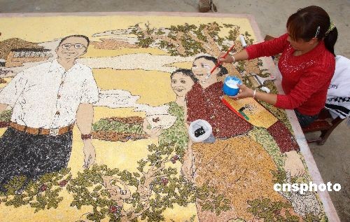 溫家寶總理兩度探望的四川大地震極重災(zāi)區(qū)青川縣黃坪鄉(xiāng),村民正用五谷雜糧制作大型粘貼畫:“總理來到棗樹村”,藝術(shù)性再現(xiàn)他親臨棗樹村關(guān)心慰問鄉(xiāng)民的情景。該畫高1.83米,寬3.05米,以木板為底,畫面色彩全部用當(dāng)?shù)厥a(chǎn)的玉米、黃豆、小豆、黑豆、蕎麥等二十多種雜糧拼貼,表達(dá)了村民與國家領(lǐng)導(dǎo)人的真摯樸實感情。中新社發(fā) 沈若飛 攝