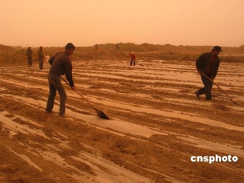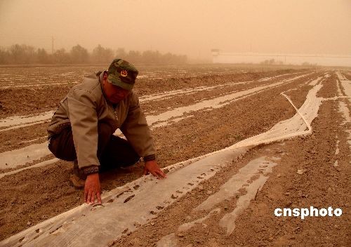 4月16日下午1點(diǎn)30分左右,距離新疆喀什市300多公里外的新疆生產(chǎn)建設(shè)兵團(tuán)農(nóng)三師小海子墾區(qū),遭遇沙塵暴侵襲,能見度一度不足50米,部分已經(jīng)出苗的棉田滴灌帶和地膜遭到破壞。肆虐的沙塵暴給當(dāng)?shù)鼐用裆a(chǎn)生活、交通以及春耕春播工作帶來(lái)不利影響。據(jù)新疆氣象部門介紹,當(dāng)天新疆喀什地區(qū)莎車、澤普、麥蓋提、葉城四縣遭遇短時(shí)沙塵暴天氣,一些縣城能見度不足600米,最大風(fēng)速達(dá)16米每秒。中新社發(fā) 肖妮娟 攝