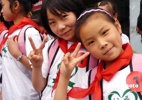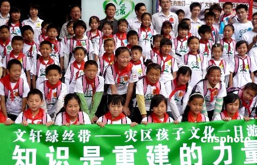 5月7日,在汶川地震一周年前夕,來自汶川災(zāi)區(qū)的百名小朋友在成都參加 “文軒綠絲帶--災(zāi)區(qū)孩子一日游”啟動(dòng)儀式,是次活動(dòng)以“知識(shí)是重建的力量”為主題,向?yàn)?zāi)區(qū)小朋友捐贈(zèng)兒童讀物,通過綠絲帶一日游活動(dòng),使災(zāi)區(qū)少年兒童健康快樂生活、樹立堅(jiān)強(qiáng)、堅(jiān)韌積極向上的生活態(tài)度,體驗(yàn)書與愛的力量。圖為參加“文軒綠絲帶--災(zāi)區(qū)孩子一日游”啟動(dòng)儀式的災(zāi)區(qū)小朋友。中新社發(fā) 錢興強(qiáng) 攝