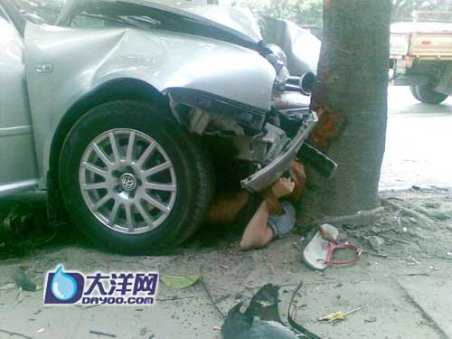 事發(fā)時,徐師傅正在檔口吃飯,“砰”地一聲巨響,差點將他手中的碗筷震落。他沖出來一看,一位少女被壓在銀灰色轎車的下邊,甚至沒有呻吟聲,便動彈不得了;一位40歲左右男子左腿生生被壓斷,躺在血泊里呻吟,另一位25歲左右的女子抓住他的手,叫他救救她。