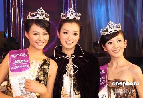 8月4日晚,2008星姐選舉在長沙落幕,圖為本年度星姐冠軍沈思倩(中)、第一亞軍沈夢辰(左)、第二亞軍王伊(右)。星姐選舉已舉辦九年,曾是中國大陸選秀節(jié)目的領(lǐng)頭羊,與往屆不同的是,本屆星姐選舉有湖南、湖北、河南三省佳麗參賽,三省媒體聯(lián)動。中新社發(fā) 張家根 攝
