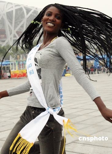 10月22日,在北京參加“2008美麗看新飛——新絲路世界模特大賽”總決賽的40多個(gè)國(guó)家和地區(qū)的50位佳麗,來(lái)到北京奧運(yùn)會(huì)主體育場(chǎng)“鳥(niǎo)巢”游覽。圖為塞內(nèi)加爾選手在“鳥(niǎo)巢”前拍照。中新社發(fā) 錢(qián)興強(qiáng) 攝