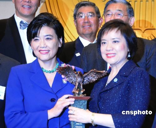 七月二十三日晚,國際領(lǐng)袖基金會在華盛頓舉行頒獎晚會,獎勵杰出的亞裔人士,在美國國會中僅有的兩名華裔議員吳振偉、趙美心分別獲得“年度杰出公職服務(wù)獎”。圖為美國“國際領(lǐng)袖基金會”執(zhí)行長、曾任美國商務(wù)部少數(shù)族裔發(fā)展署副署長兼幕僚長的華裔政界名媛董繼玲(右),向美國華裔女眾議員趙美心頒獎。國際領(lǐng)袖基金會為全美最著名的亞裔青年領(lǐng)袖訓(xùn)練機構(gòu),每年定期表揚促進國際經(jīng)貿(mào)繁榮、發(fā)揚中華文化傳承有卓越成就的杰出人士。中新社發(fā) 吳慶才 攝