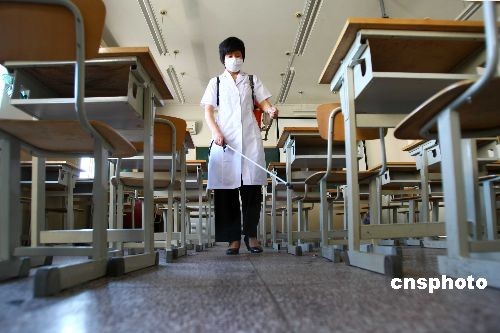 6月22日周一,北京市海淀區(qū)二里溝中心小學(xué)的老師在同學(xué)到來(lái)之前為校室進(jìn)行全面的消毒,嚴(yán)防甲型H1N1。近日,針對(duì)甲型H1N1流感警戒級(jí)別升至6級(jí),北京市衛(wèi)生局、教委聯(lián)合印發(fā)《北京市學(xué)校傳染病防控工作管理指導(dǎo)意見(jiàn)》,北京市各學(xué)校須每周至少對(duì)教室、走廊等處所消毒一次,在特殊時(shí)期要每日消毒。中新社發(fā) 富田 攝