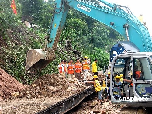經(jīng)過(guò)上千名鐵路職工和武警官兵24小時(shí)不間斷搶修,暴雨天氣引發(fā)巖石崩塌而被迫中斷的滬昆鐵路,在中斷40小時(shí)后于2009年7月8日7時(shí)18分恢復(fù)通車。