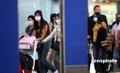 連日來(lái),香港H1N1流感病例繼續(xù)增加,確診個(gè)案已突破一百宗。六月十五日,香港衛(wèi)生防護(hù)中心總監(jiān)曾浩輝表示,H1N1流感已跨區(qū)存在,相信其它區(qū)域也會(huì)出現(xiàn)個(gè)案,現(xiàn)時(shí)的個(gè)案屬冰山一角,相信一兩周,會(huì)有雙位增長(zhǎng)。圖為抵港的旅客戴上口罩預(yù)防感染。中新社發(fā) 洪少葵 攝