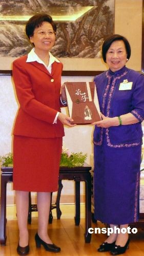 7月8日,中華全國(guó)婦女聯(lián)合會(huì)副主席黃晴宜(左)來到臺(tái)北,隨后前往臺(tái)灣中華婦聯(lián)總會(huì)拜會(huì)該會(huì)主委辜嚴(yán)倬云女士。全國(guó)婦聯(lián)此行是建會(huì)60年來首次組大型代表團(tuán)到臺(tái)灣訪問,辜嚴(yán)倬云曾于2年前率臺(tái)灣中華婦聯(lián)總會(huì)到北京訪問。圖為雙方致贈(zèng)紀(jì)念禮物。中新社發(fā) 劉舒凌 攝