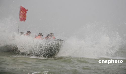 2009年6月13日,安徽巢湖預(yù)備役團(tuán)水上搶險(xiǎn)救災(zāi)分隊(duì)130余人攜12艘沖鋒舟在巢湖水面上擺兵布陣,進(jìn)行水上“S” 形穿越、水上越障、抗洪搶險(xiǎn)救災(zāi)、解救被困群眾、打撈救護(hù)、水上編隊(duì)等科目的實(shí)戰(zhàn)演練,以應(yīng)對(duì)大汛期間各類水上搜救。 中新社發(fā) 李遠(yuǎn)波 攝