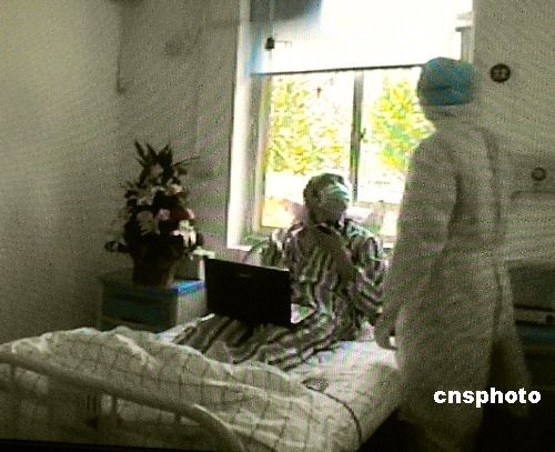 五月十三日中午,在山東省城濟(jì)南市傳染病醫(yī)院接受治療的輸入性甲型H1N1流感疑似患者呂某某目前身體、精神各情況已基本恢復(fù)。疑似患者呂某某在十一日晚剛從濟(jì)南火車站下車時體溫一度高達(dá)三十八點(diǎn)九攝氏度。經(jīng)過濟(jì)南市傳染病醫(yī)院的醫(yī)護(hù)治療,體溫已降至三十六點(diǎn)七攝氏度。圖為記者從醫(yī)院監(jiān)控系統(tǒng)的電視屏幕上拍到的患者正在與醫(yī)生交談。中新社發(fā) 張璐 攝