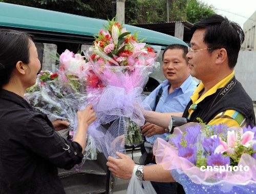 5月27日傍晚,在福州定點(diǎn)場(chǎng)所解除醫(yī)學(xué)觀察后,兩名福建省首例輸入性甲型H1N1流感確診患兒同機(jī)接觸者接受親友(左一)贈(zèng)送的鮮花。當(dāng)日,福建省衛(wèi)生廳在其網(wǎng)站上發(fā)布福建省甲型H1N1流感防控信息通報(bào),截止5月26日24:00,衛(wèi)生部通報(bào)福建省首例輸入性甲型H1N1流感確診患兒病情進(jìn)一步好轉(zhuǎn),無咳嗽及流涕,無并發(fā)癥,精神狀態(tài)良好,體溫正常,已連續(xù)3天體溫低于37℃。根據(jù)專家組的意見,該患兒同機(jī)的30名在閩密切接觸者隔離醫(yī)學(xué)觀察期限為5月27日20時(shí)。屆時(shí)密切接觸者如無特殊情況,即按期解除醫(yī)學(xué)觀察;純河H屬及就診過程中的8名密切接觸者將按其與患兒脫離接觸的時(shí)間起算,隔離滿7日后,陸續(xù)解除醫(yī)學(xué)觀察。中新社發(fā) 劉可耕 攝