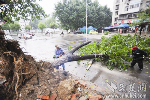 記者看到,在環(huán)山路東西湖區(qū)人民醫(yī)院附近的一個拆遷區(qū),這棵茂盛的梧桐樹根部拔起,歪倒于馬路上,將整條道路截斷。來往車輛調(diào)頭繞行。在事發(fā)地對面餐館工作的王先生介紹,29日中午11時35分,正在下大雨,這棵十余米高的梧桐樹根部松動,繼而“轟”的一聲倒地。當(dāng)時,兩名打著雨傘的女青年正好路過,梧桐樹的樹枝將她們的傘壓彎,兩人雖無礙,但也嚇得花容失色。