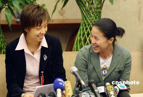 十月十七日,中共十七大代表、乒乓球運動員王楠、張怡寧在北京梅地亞中心接受中外媒體采訪。當有記者問及訓(xùn)練以外的生活細節(jié)時,二人相視而笑。中新社發(fā) 毛建軍 攝