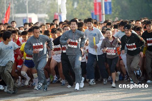 十月二十一日,2007年全日空北京國(guó)際馬拉松賽在北京國(guó)家?jiàn)W林匹克體育中心鳴槍開(kāi)跑,陸毅、馬伊俐等影視演員以及北京國(guó)安足球隊(duì)隊(duì)員徐云龍等參加了馬拉松比賽。中新社發(fā) 盛佳鵬 攝