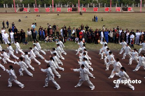 11月2日,湖南漣鋼離退休老職工參加千人太極拳表演。據(jù)悉,該集團(tuán)為宣傳奧運(yùn)會(huì)精神,開展“與奧運(yùn)同行,與健康同行”千人太極拳表演活動(dòng)。中新社發(fā) 郭國(guó)權(quán) 攝