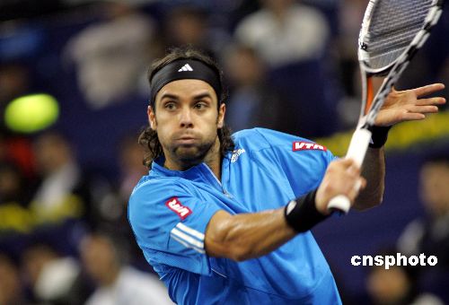 11月12日,“智利火炮”岡薩雷斯在2007上海網(wǎng)球大師杯賽紅組單打比賽中,實現(xiàn)驚人逆轉(zhuǎn)以2比1戰(zhàn)勝瑞士球王費(fèi)德勒,三盤比分是3-6、7-6、7-5。中新社發(fā) 湯彥俊 攝