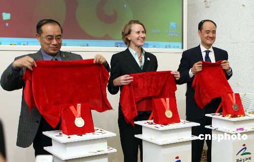 十一月十四日,北京奧組委發(fā)布2008年殘奧會(huì)獎(jiǎng)牌式樣,其設(shè)計(jì)創(chuàng)意、造型與北京奧運(yùn)會(huì)獎(jiǎng)牌一脈相承,體現(xiàn)了“兩個(gè)奧運(yùn) 同樣精彩”的要求。殘奧會(huì)獎(jiǎng)牌正面鑲玉的設(shè)計(jì)靈感來(lái)自中國(guó)古代的玉器造型,中間為北京2008年殘奧會(huì)會(huì)徽;玉的色澤隨金、銀、銅牌有所變化,分別為白玉、青白玉、青玉。中新社發(fā) 任海霞 攝