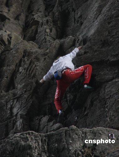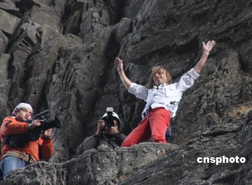 11月18日,法國(guó)“蜘蛛人”阿蘭·羅伯特經(jīng)過(guò)近1個(gè)小時(shí)的無(wú)保護(hù)徒手攀登,成功登上湖南張家界天門山天門洞左側(cè)高度約200米的巖壁,順利完成挑戰(zhàn)天門洞的計(jì)劃。中新社發(fā) 郭國(guó)權(quán) 攝