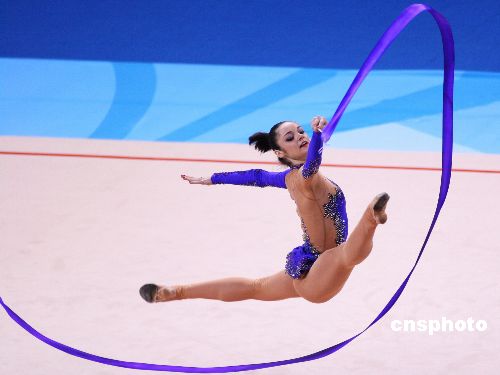 圖為希臘世錦賽上個(gè)人全能排名第一的烏克蘭選手安娜·別索諾娃在進(jìn)行繩操項(xiàng)目的爭(zhēng)奪。
