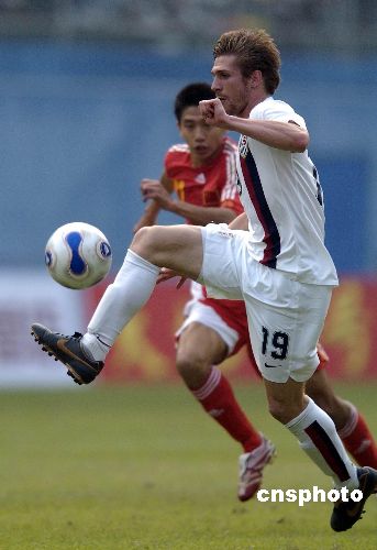 2007年12月16日下午,中國(guó)國(guó)奧隊(duì)與美國(guó)國(guó)奧隊(duì)的第二場(chǎng)友誼賽在廣州越秀山體育場(chǎng)鳴哨。在上半場(chǎng)比賽中,大幅調(diào)整陣容的中國(guó)國(guó)奧隊(duì)完全被對(duì)手壓制,美國(guó)隊(duì)由羅杰斯、蘭尼和達(dá)維斯各入一球,早早以3比0領(lǐng)先。國(guó)奧隊(duì)主帥杜伊在下半場(chǎng)頻繁換將,國(guó)奧小將們展開(kāi)反撲,朱挺、杜震宇相繼送出精彩入球,最終比分為3比3。補(bǔ)時(shí)階段王曉龍不理智的犯規(guī)引發(fā)雙方?jīng)_突,其與克里斯坦雙雙被罰下。中新社發(fā) 吳峻 攝