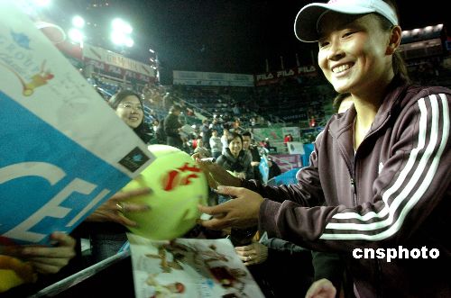 一月五日,彭帥在香港網(wǎng)球精英賽優(yōu)秀組女子決賽中以二比一戰(zhàn)勝沃茲尼亞基,奪得冠軍。圖為彭帥賽后為觀眾簽名。中新社發(fā) 鄧慶樂 攝