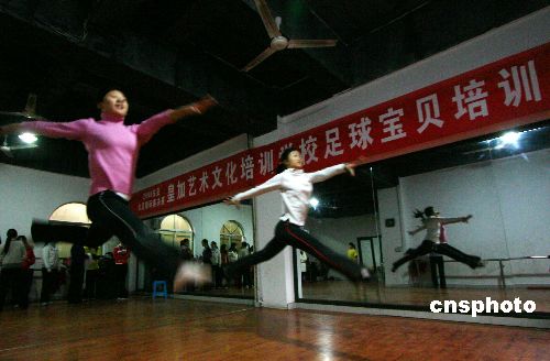 1月15日,東亞女足的“足球?qū)氊悺眰冊谟?xùn)練。2008年東亞女足錦標(biāo)賽將于2月17日-24日在重慶市永川區(qū)體育中心舉行,永川區(qū)從該區(qū)大中院校選出42名“足球?qū)氊悺,進(jìn)行為期一個(gè)月的藝術(shù)體操、姿態(tài)等基本功訓(xùn)練,屆時(shí)將以嶄新身姿展現(xiàn)在人們面前。中新社發(fā) 陳仕川 攝