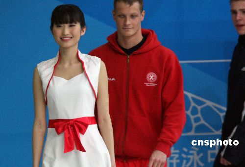 2月1日,“好運(yùn)北京”中國(guó)游泳公開賽舉行六個(gè)項(xiàng)目的決賽,以大學(xué)生為主的頒獎(jiǎng)禮儀小姐為備戰(zhàn)北京奧運(yùn)會(huì)現(xiàn)場(chǎng)熱身。中新社發(fā) 任晨鳴 攝