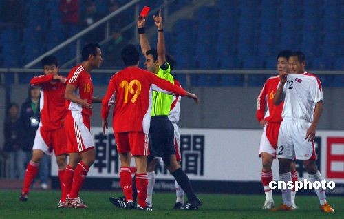 2月23日晚,男足東亞四強賽正式落下帷幕,在最后一場中國隊對陣朝鮮隊的比賽中,中國隊雖3:1獲勝,但被主裁判出示8張黃牌、2張紅牌,創(chuàng)本屆比賽得牌記錄。最終,韓國隊?wèi){借進(jìn)球數(shù)優(yōu)勢奪得冠軍,并獲得50萬美元獎金,日本隊屈居亞軍,主場作戰(zhàn)的中國隊獲第三,朝鮮隊墊底。圖為主裁判向中國隊員出示紅牌。中新社發(fā) 郭晉嘉 攝