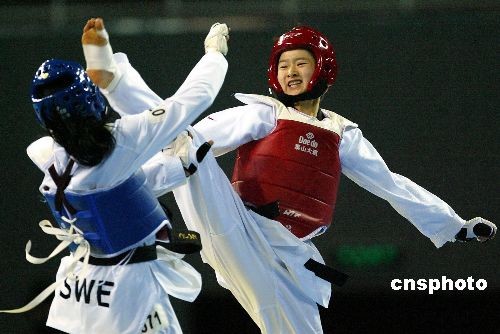 2月26日,“好運北京”2008跆拳道國際邀請賽在北京科技大學開幕,中國選手吳靜鈺在當晚進行的女子49公斤以下級比賽中獲得金牌,這也是本屆比賽產(chǎn)生的首枚金牌。中新社發(fā) 富田 攝