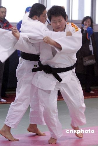 三月十二日,世界冠軍佟文(右)等中國女子柔道隊優(yōu)秀選手在天津訓練基地與男選手對練,為奧運奪金積極備戰(zhàn)。中新社發(fā) 毛建軍 攝