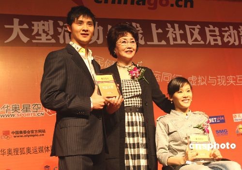 3月27日,前著名運(yùn)動(dòng)員田亮(左)和桑蘭,從中國(guó)奧委會(huì)副主席何慧嫻(中)手中接過(guò)“加油中國(guó)”形象大使證書(shū)。當(dāng)日,由中國(guó)最大的垂直體育門(mén)戶(hù)網(wǎng)站華奧星空主辦的“加油中國(guó)”大型活動(dòng)與線上社區(qū)啟動(dòng)儀式,在北京舉行。中新社發(fā) 趙振清 攝