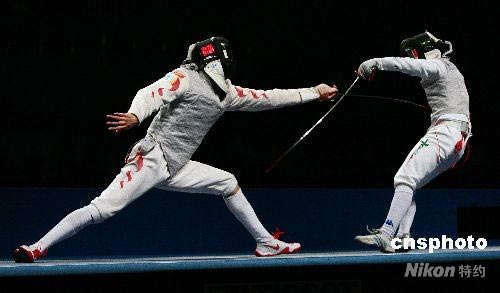 4月18日,“好運北京”2008國際劍聯(lián)世界錦標(biāo)賽在國家會議中心擊劍館打響,首先進行的是男子花劍團體的比賽,在1/4決賽中,雅典奧運會團體金牌得主意大利隊(右)以45-33的比分戰(zhàn)勝了東道主中國隊(左),率先挺進4強。中新社發(fā) 富田 攝