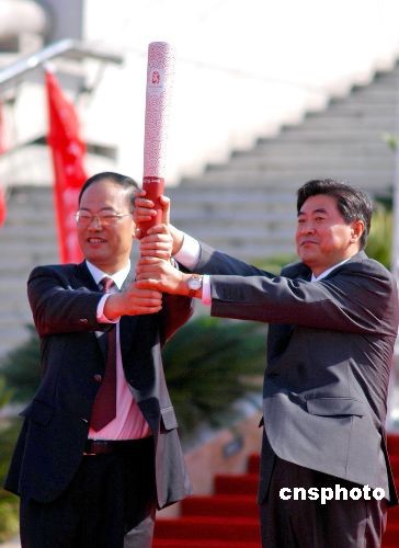 五月十二日上午,北京奧運(yùn)會火炬在福建省泉州市閩臺緣博物館廣場開始傳遞。圖為新上任的泉州市委書記徐鋼(左)從北京奧組委火炬接力中心副主任劉寶杰手中接過“祥云”。中新社發(fā) 傅丹丹 攝