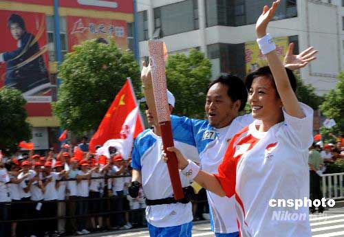 5月29日,奧運圣火在安徽蕪湖傳遞,演員趙薇傳遞首棒火炬。中新社發(fā) 廖攀 攝