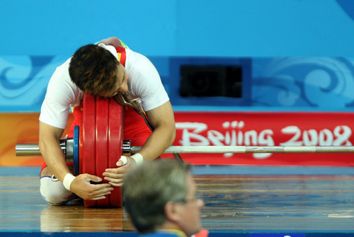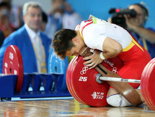 8月11日,中國(guó)選手張湘祥獲勝后親吻杠鈴。當(dāng)日,張湘祥在北京奧運(yùn)會(huì)舉重男子62公斤級(jí)決賽中以319公斤的總成績(jī)獲得金牌。