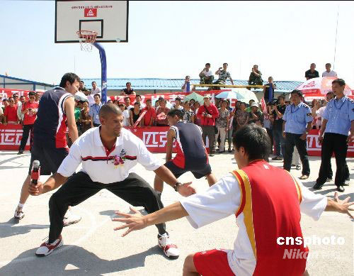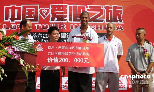 9月1日上午,參加“08中國愛心之旅”的NBA火箭隊球星巴蒂爾,來到四川地震極重災(zāi)區(qū)都江堰市勤儉人家災(zāi)民安置點(diǎn)慰問災(zāi)區(qū)民眾。中新社發(fā) 霍潺 攝