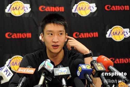 9月24日下午,美國NBA洛杉機湖人隊在自己的訓(xùn)練基地舉行記者會,正式向媒體記者介紹剛剛加盟的中國球員孫悅。孫悅在記者會上用流利的英語回答記者提問。孫悅說,他對自己在湖人隊的位置很清醒,自己會加倍努力,盡量多爭取上場時間。圖為孫悅向記者解釋外號“Q”的來歷。中新社發(fā) 張煒 攝