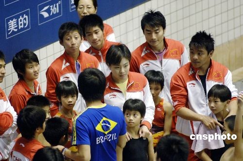 10月18日,奪得北京奧運7金1銀3銅的中國跳水“夢之隊”成員郭晶晶、吳敏霞、何沖等在福州給小跳水運動員傳授技藝。當日,2008全國跳水錦標賽在福建省體育中心游泳跳水館開賽。中新社發(fā) 王東明 攝