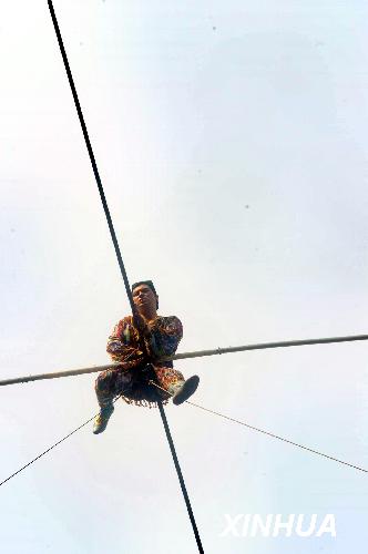 10月18日,新疆“達(dá)瓦孜”傳人賽買提·艾山在湖南張家界市天門山挑戰(zhàn)世界最大坡度高空走鋼絲時(shí)發(fā)生意外,在距終點(diǎn)50米處跌坐在鋼繩上,被迫放棄挑戰(zhàn)。意外發(fā)生后,地面安全人員及時(shí)展開救援,歷時(shí)1小時(shí)16分鐘將懸坐在400米高空鋼繩上的賽買提順利救出。 新華社記者龍弘濤攝