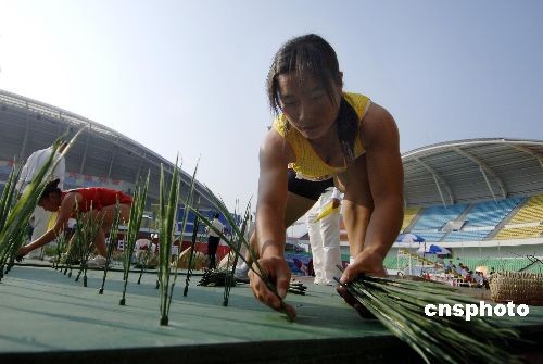 10月29日,第六屆全國農運會田徑賽事在福建泉州海峽體育中心激戰(zhàn)正酣。農運會田徑比賽也分田賽和徑賽,當天進行的田賽很有“田”的味道,插秧比賽要跑60米,途中要將300棵塑料“秧苗”全部插進插秧板上的小洞。中新社發(fā) 王東明 攝