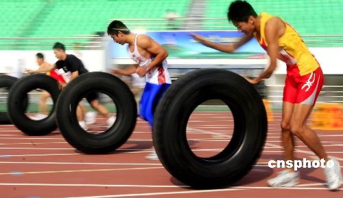 十月三十日,第六屆全國(guó)農(nóng)民運(yùn)動(dòng)會(huì)田徑比賽在福建泉州海峽體育中心拉開(kāi)帷幕后,進(jìn)行了技巧性極高的男、女100米推輪胎賽跑比賽。圖為運(yùn)動(dòng)員在推輪胎賽跑。中新社發(fā) 傅丹丹 攝