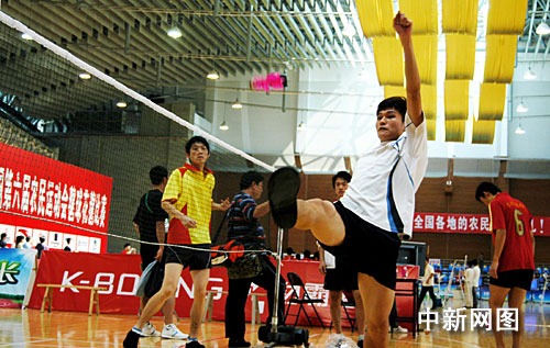 十月三十日,第六屆全國(guó)農(nóng)民運(yùn)動(dòng)會(huì)毽球比賽在福建省泉州市海峽體育中心舉行,參賽選手們身輕如燕、騰空跳踢的本領(lǐng)讓現(xiàn)場(chǎng)觀眾驚嘆。