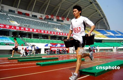 十月三十日,第六屆全國(guó)農(nóng)民運(yùn)動(dòng)會(huì)田徑比賽在福建泉州海峽體育中心拉開(kāi)帷幕后,進(jìn)行了男子5分鐘50米抗旱提水保苗賽跑比賽,這是一項(xiàng)考驗(yàn)運(yùn)動(dòng)員耐力和技巧的項(xiàng)目,最后一分鐘,是運(yùn)動(dòng)員體力的大考驗(yàn)。中新社發(fā) 傅丹丹 攝