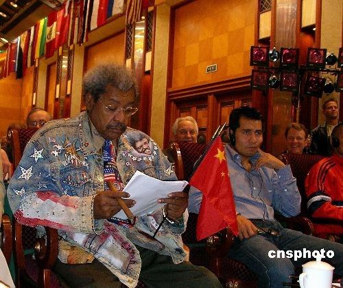 11月3日上午,世界拳擊理事會(WBC)第46屆年會在成都錦江賓館開幕,來自35個國家和地區(qū)的300多名拳擊界人士與會。圖為著名拳擊推廣人唐·金(左)出席年會開幕式。中新社發(fā) 楊杰 攝