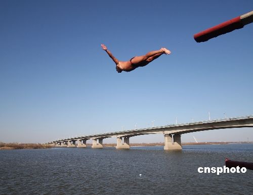 11月7日上午,在哈爾濱松花江公路大橋西側(cè),黑龍江省冬泳協(xié)會冬泳健兒在苦練高臺跳水。當(dāng)日正好是立冬節(jié)氣,也是距大冬會103天的好日子。中新社發(fā) 姚庭山 攝