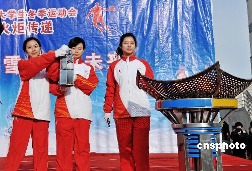 哈爾濱第24屆世界大學(xué)生冬季運(yùn)動(dòng)會(huì)火炬?zhèn)鬟f于2008年12月22日在大慶市傳遞。傳遞時(shí)間30分鐘,路程2.6公里;10時(shí)12分大慶市人民政府市長(zhǎng)夏立華致詞,冰雪使者引回圣火,熄滅圣火盆, 哈爾濱第24屆世界大學(xué)生冬季運(yùn)動(dòng)會(huì)火炬?zhèn)鬟f在黑龍江省大慶市傳遞圓滿結(jié)束。中新社發(fā) 濱海之光 攝